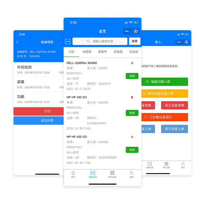 质检平台主要面向企业用户及个人用户,为用户提供优质便捷的验机一站式服务。根据设备的外观、功能、屏幕等损坏程度或使用情况进行评估并自动生成报告